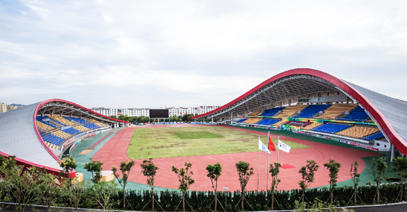 體育場頂蓋采用左右不對稱的設計理念,與相鄰的體育館形成了一條流暢的波浪形天際線,