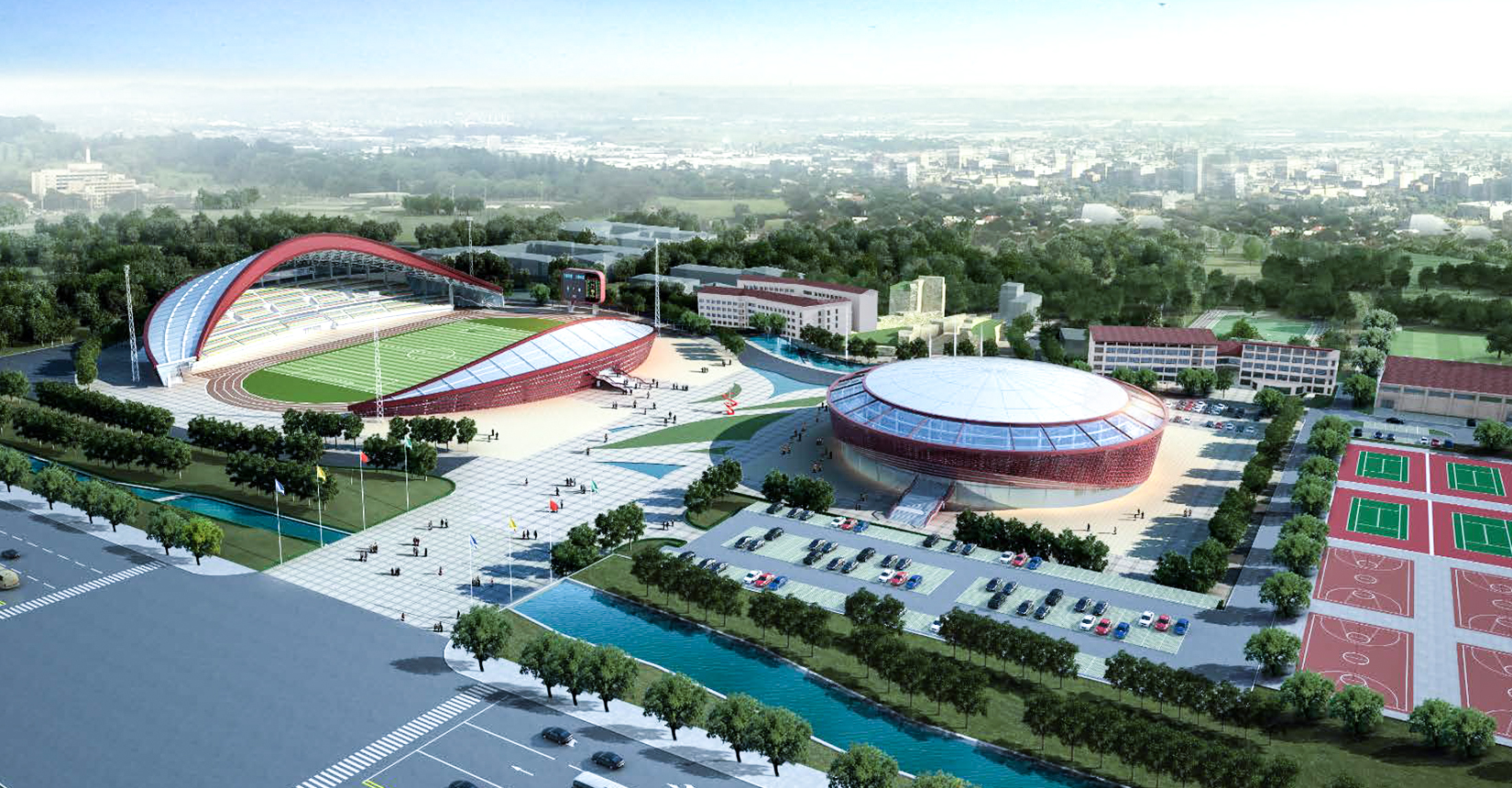 幕式而建,由一座一萬人左右的體育場和一座3500 人左右的體育館組成。兩棟建筑之間為