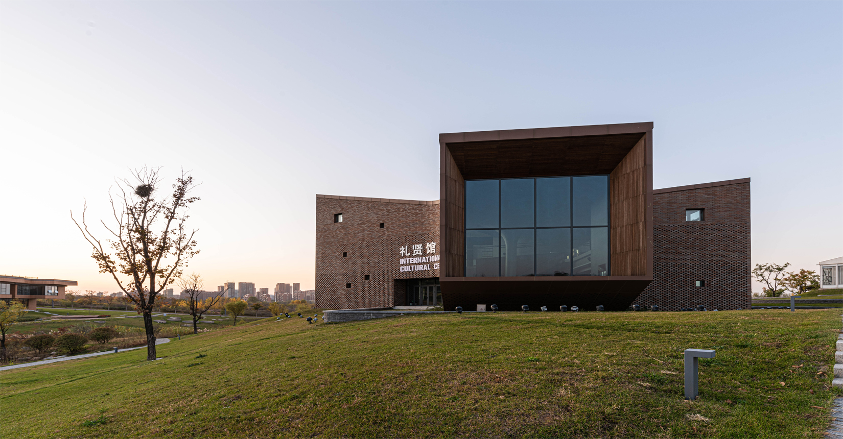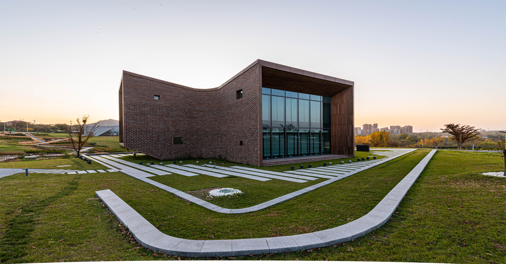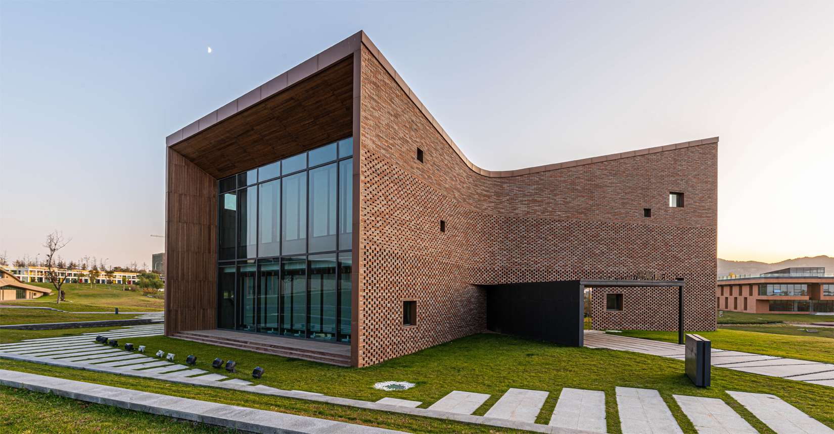 建筑南側(cè)設(shè)置次要出入口,并與水流形成互動。建筑立面材質(zhì)采用精致的磚材拼面,屋頂采用微微揚起的處理手法;穩(wěn)重且不失變化。