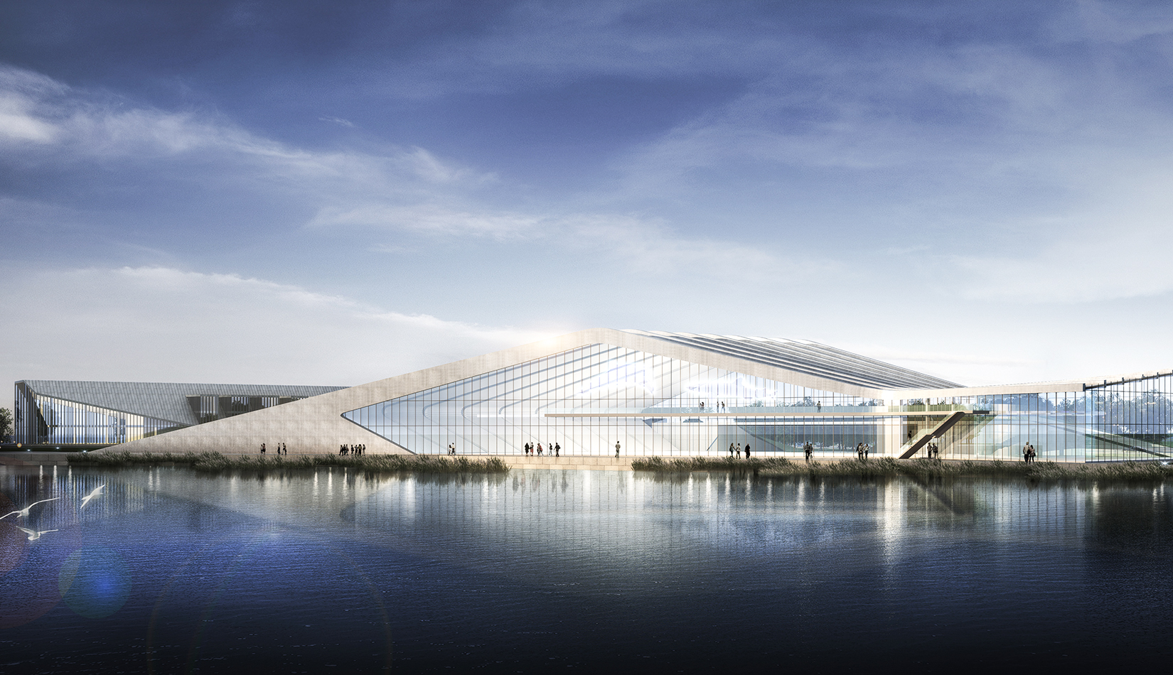 海洋科技館坐落在中科院青島科教園沿海區(qū)的中心地帶,沿海岸線呈一字型布局。方案設計以浪花和貝殼為意象,建筑像從場地中生長出來,擁有著與海浪一樣流暢的外形,在與基址和諧相融的同時,也呼應著青島的城市文化和人文關(guān)系。大跨度鋼結(jié)構(gòu)結(jié)構(gòu)排架為大空間的開放展示提供了可能,同時營造了無間斷的觀??臻g??萍拣^外墻以玻璃幕墻為主,保證了觀海景觀通透性。