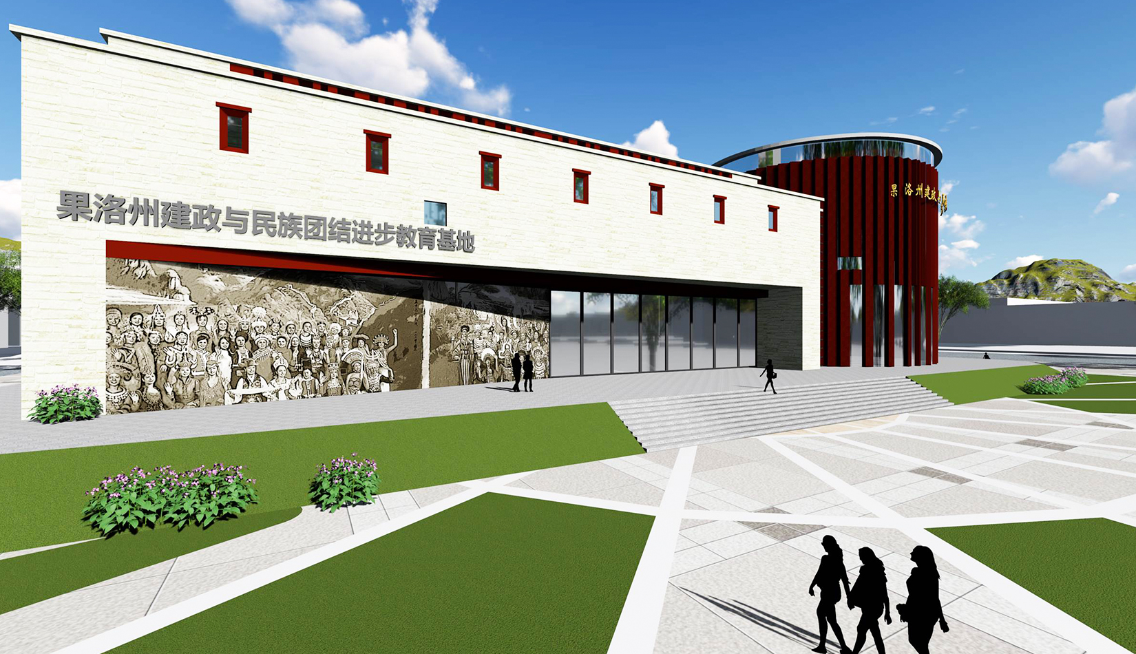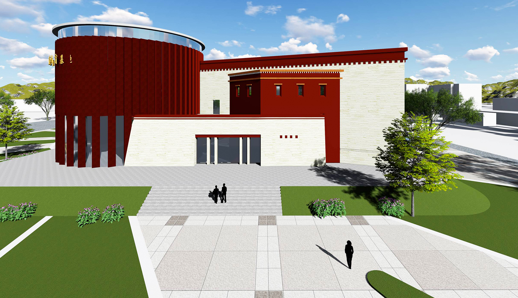 設計造型整體為中心聚攏的形態(tài),圓形體塊是建筑的核心,象征著黨的領導,各分支體塊象征著分布在果洛的各個民族,體現(xiàn)出各民族團結(jié)一心,同心向黨,在黨的領導下團結(jié)一致、共同奮斗;另一方面,圓形體塊與各分支體塊的簇擁關系也象征著各民族緊密團結(jié),永不分離。