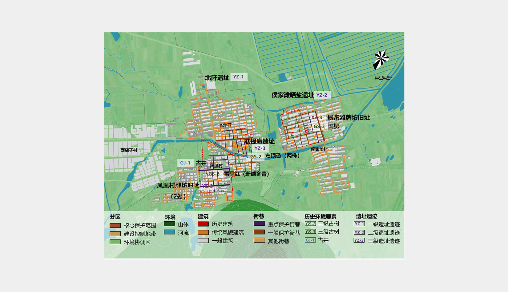 金口村保護(hù)規(guī)劃總圖分為五級:分區(qū)保護(hù)、建筑保護(hù)、街巷保護(hù)、歷史環(huán)境要素保護(hù)、遺址遺跡保護(hù)。
