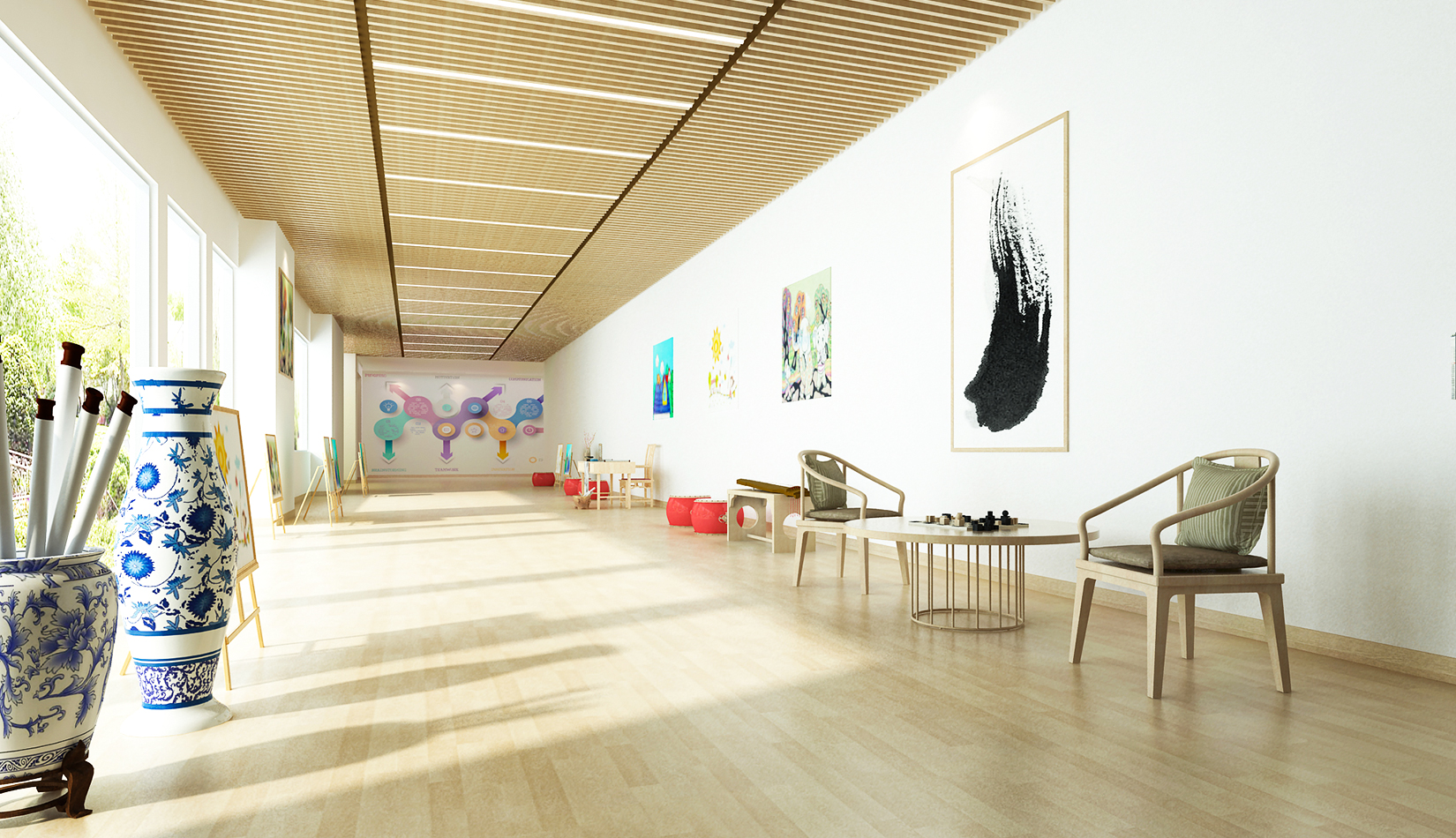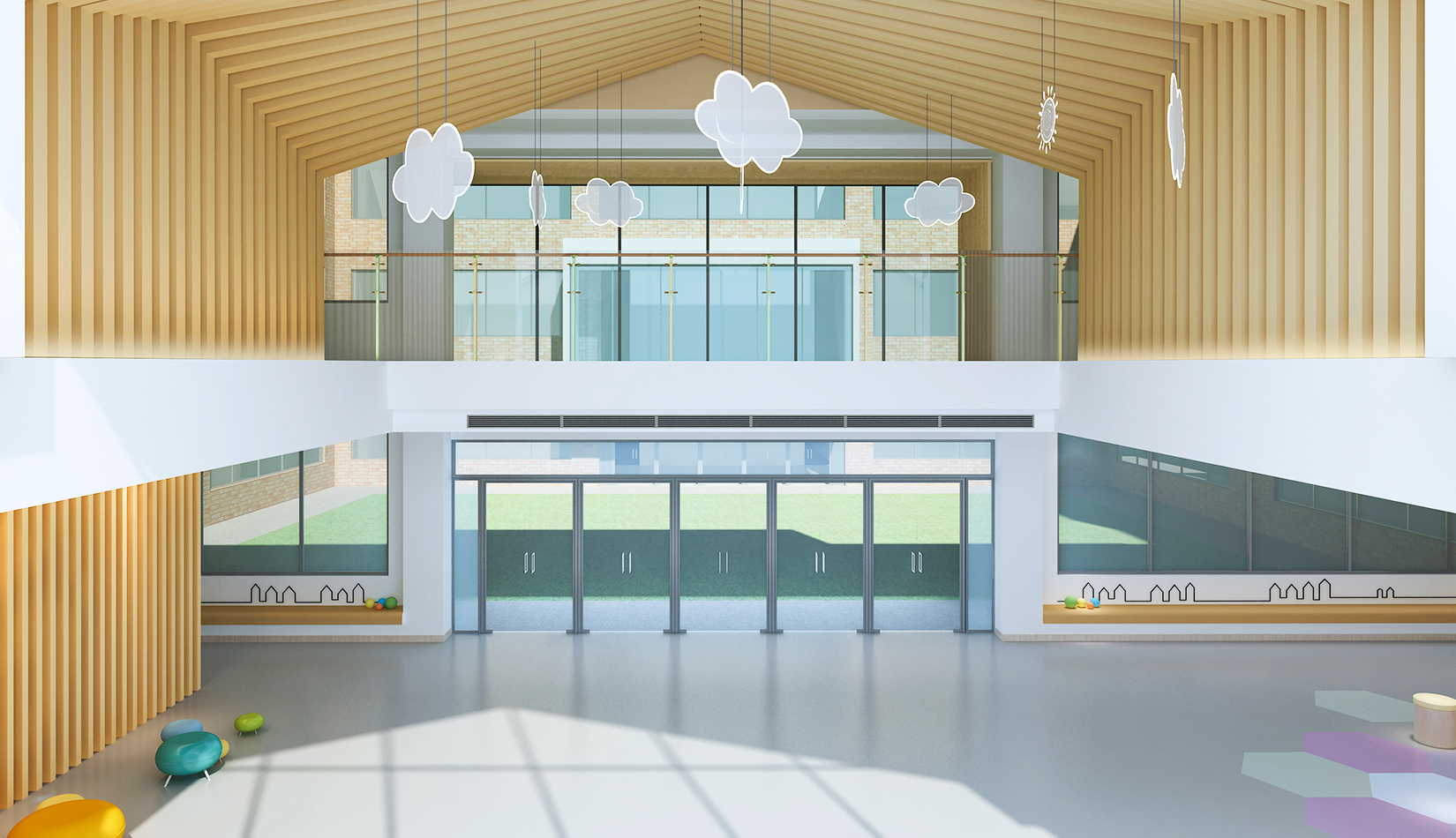 室內(nèi)延續(xù)建筑,空間內(nèi)部采光非常好。設(shè)計(jì)簡潔、現(xiàn)代,以白色為主色調(diào),搭配淺木色作為室內(nèi)顏色。活潑、好動(dòng)、天真、可愛是兒童最大的特點(diǎn),在其具體功能空間設(shè)計(jì)中,我們把這些特點(diǎn)和空間色彩結(jié)合起來,不同的空間根據(jù)其使用功能,采用了不同的色彩搭配。