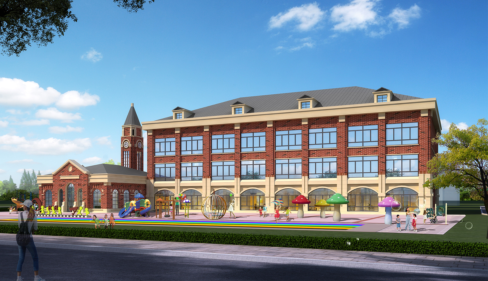 項目在設(shè)計中從幼兒特點考慮,通過活動空間、明快色彩以及建筑造型的展示,意在創(chuàng)造符合幼兒心理的童話世界。