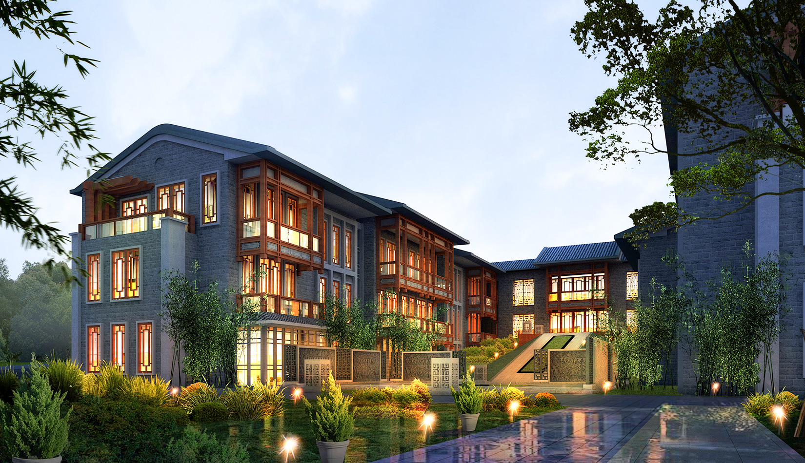 建筑造型采用中國古典建筑形式,立面符號提煉古典的建筑符號,努力營造出中國傳統(tǒng)私塾的學院派的風格。