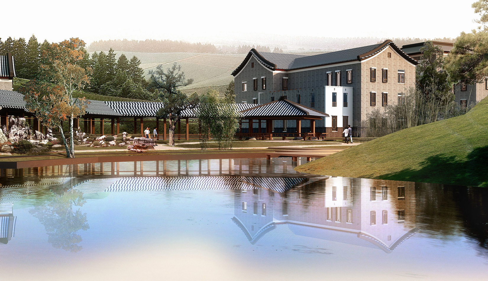 在構(gòu)思和總體布局上引入“潛龍情節(jié)”。結(jié)合用地南北狹長、北面臨海的地形特征和自由靈活的建筑布局,將中華民族的文化象征——龍圖騰與傳統(tǒng)文化的燦爛之花——書畫藝術(shù)相結(jié)合,將主要軸線以龍為形,寓意著書畫藝術(shù)的振興和華夏文化的騰飛。